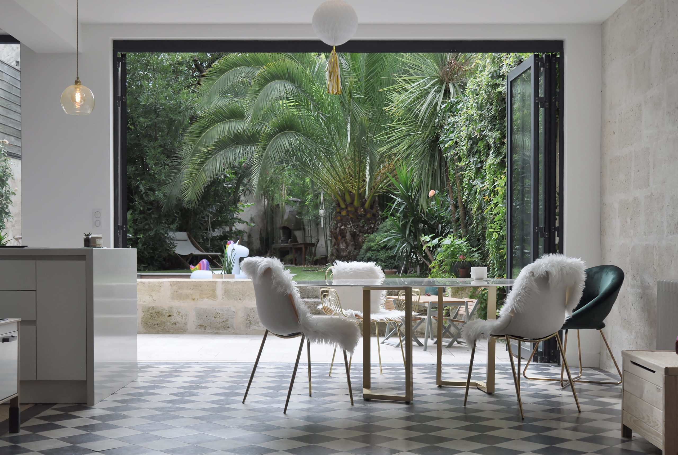 Cette belle maison Bordelaise a été surélévée coté rue et entièrement repensée côté jardin pour coller aux nouveaux usages. La cuisine, qui représente un lieu de vie par exelence pour ses nouveaux occupants, est positionnée directement sur le jardin exposé Sud. Celle-ci profite d’une large baie accordéon pour s’ouvrir entièrement sur le jardin et sa piscine.