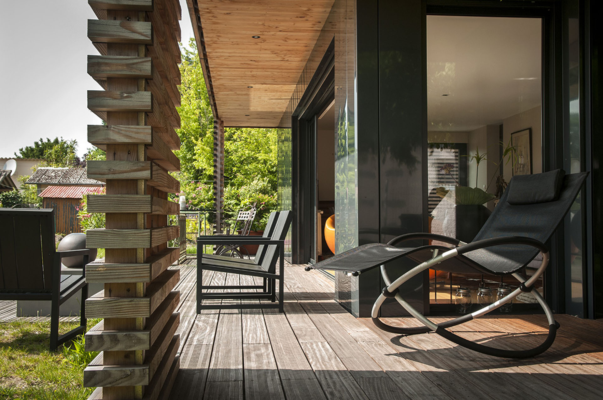 Nous avons donc dessiné une sorte de boite “ à la japonaise ”, bardée de bois ajouré qui dessine un parallélépipède parfait quand tout est fermé.