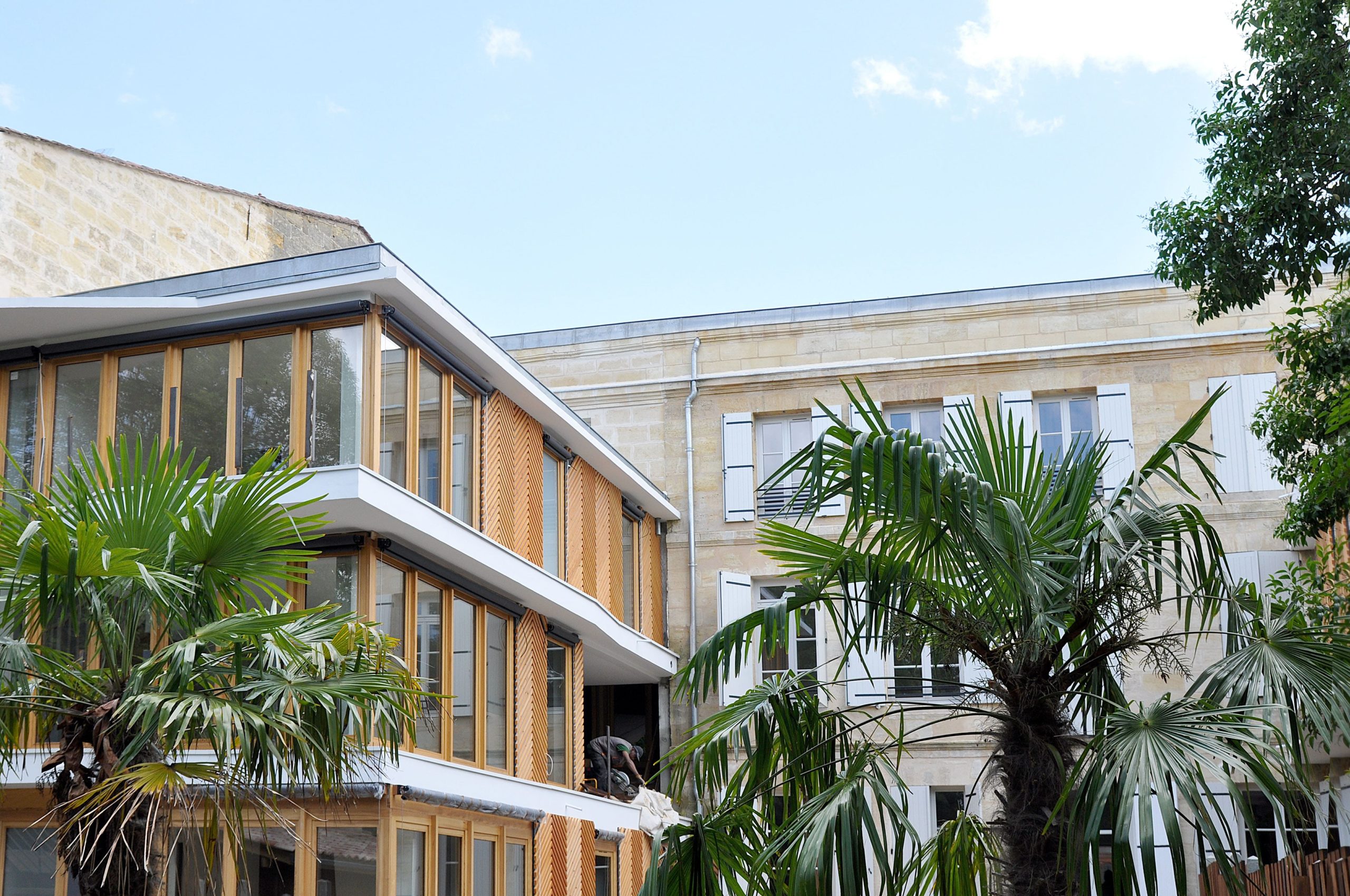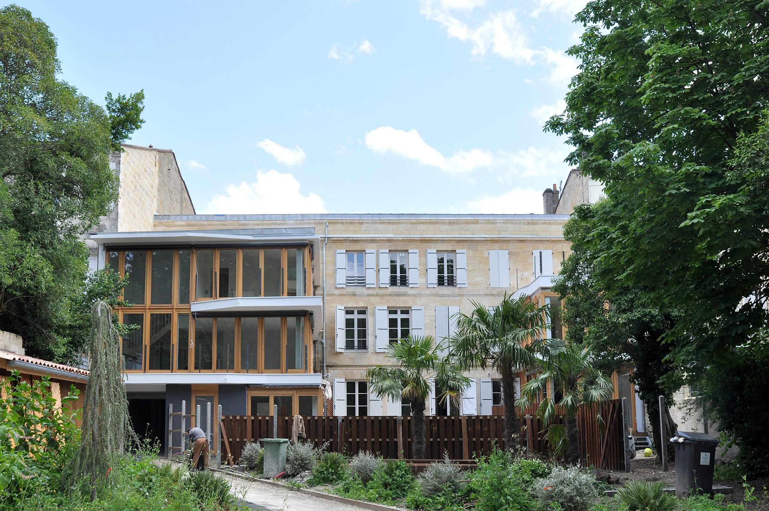 Cette réalisation est le fruit de la rénovation et de l’extension d’un immeuble en pierre rue Edmond Costedoat à Bordeaux. Le corps de bâtiment ancien conserve ses qualités patrimoniales avec sa façade composée, sa pierre typique de la ville et ses parquets anciens. Sur l’arrière du bâtiment prennent place deux oreillettes contemporaines rythmées par un bardage de chevrons de bois s’ouvrant largement sur un jardin arboré.