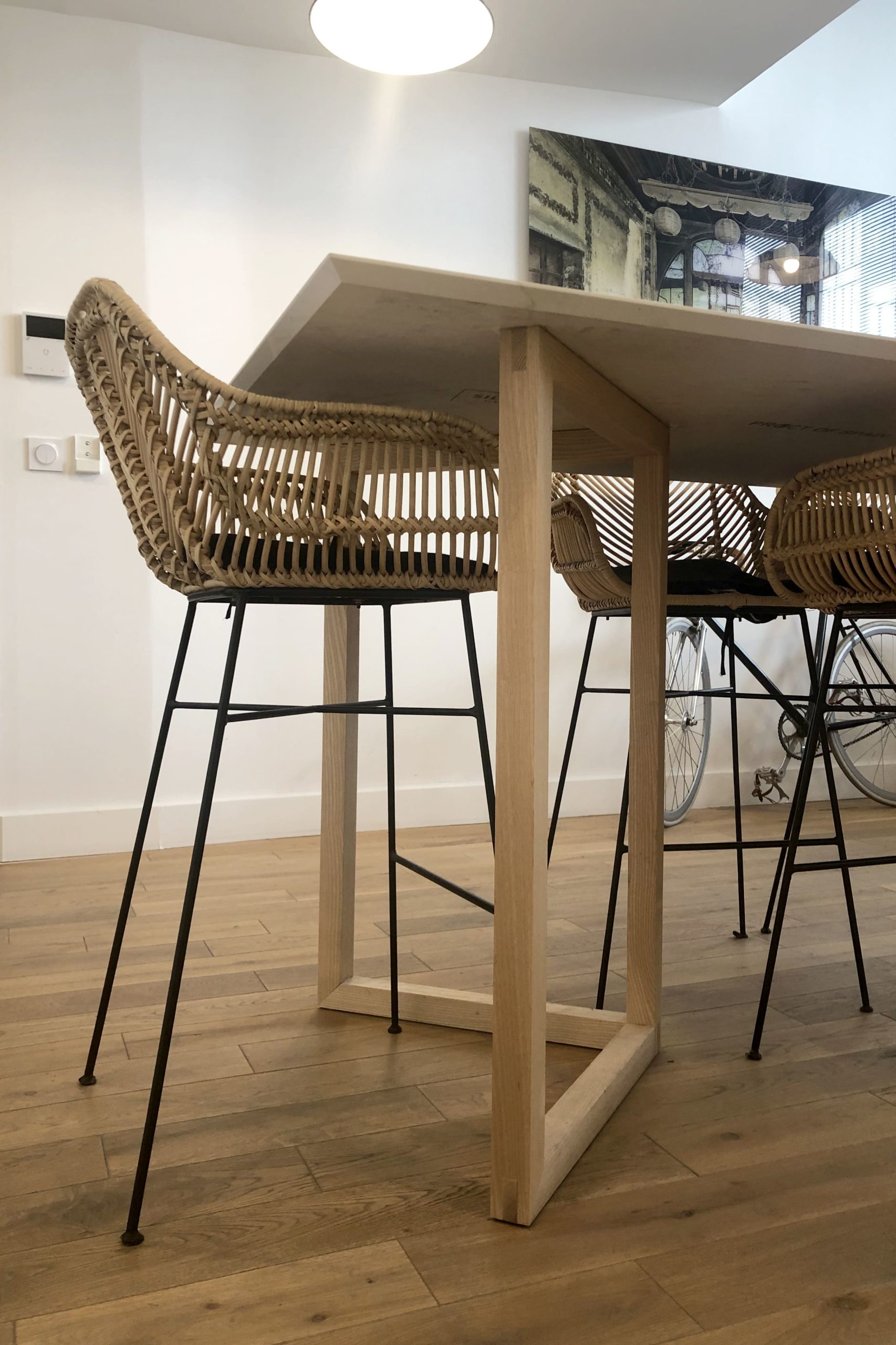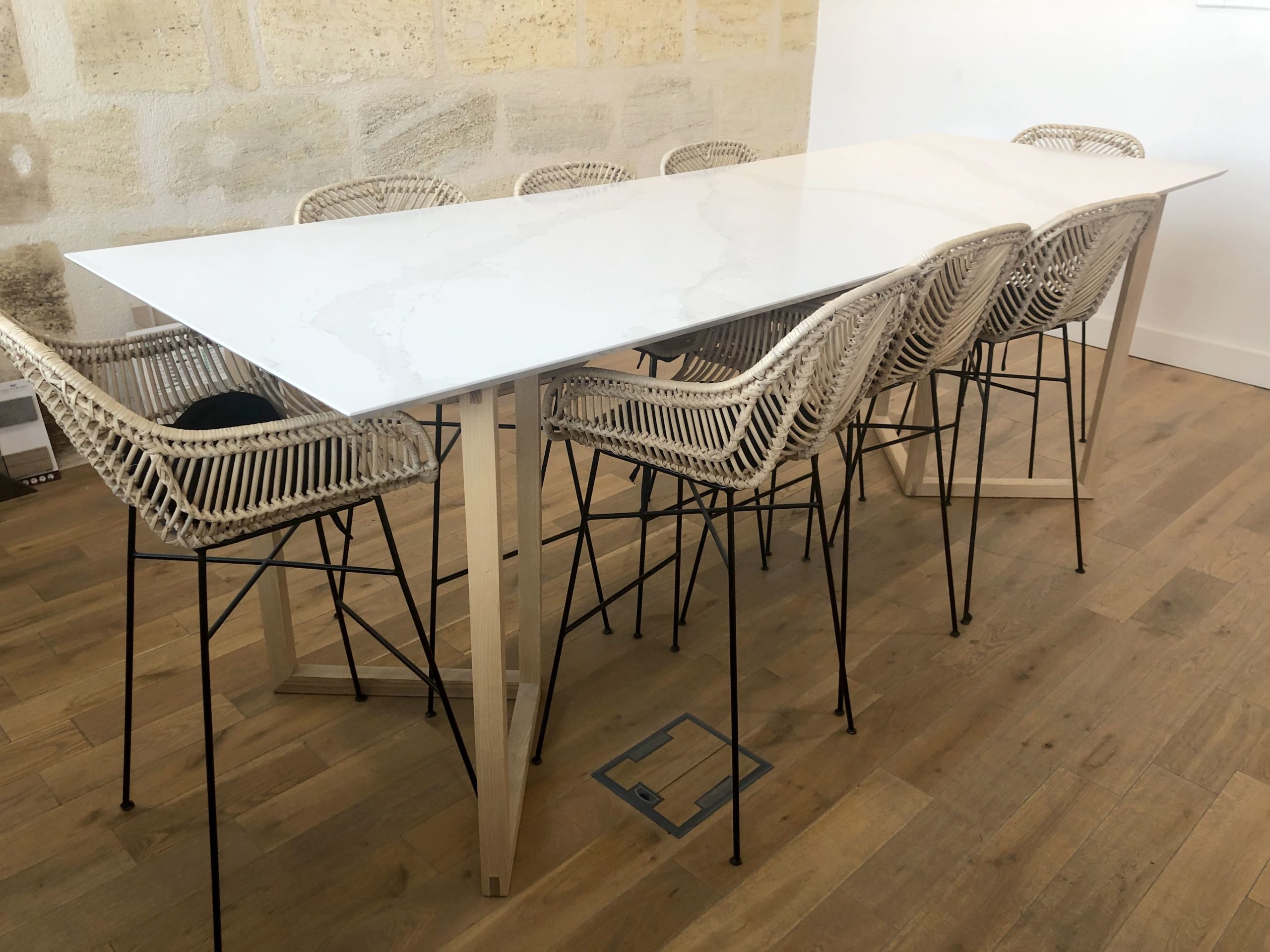 Création de deux tables pour la salle de réunion et la cuisine de notre agence. Le plateau en Sileston et le piètement en chêne se répondent pour créer un design sobre et chaleureux.
