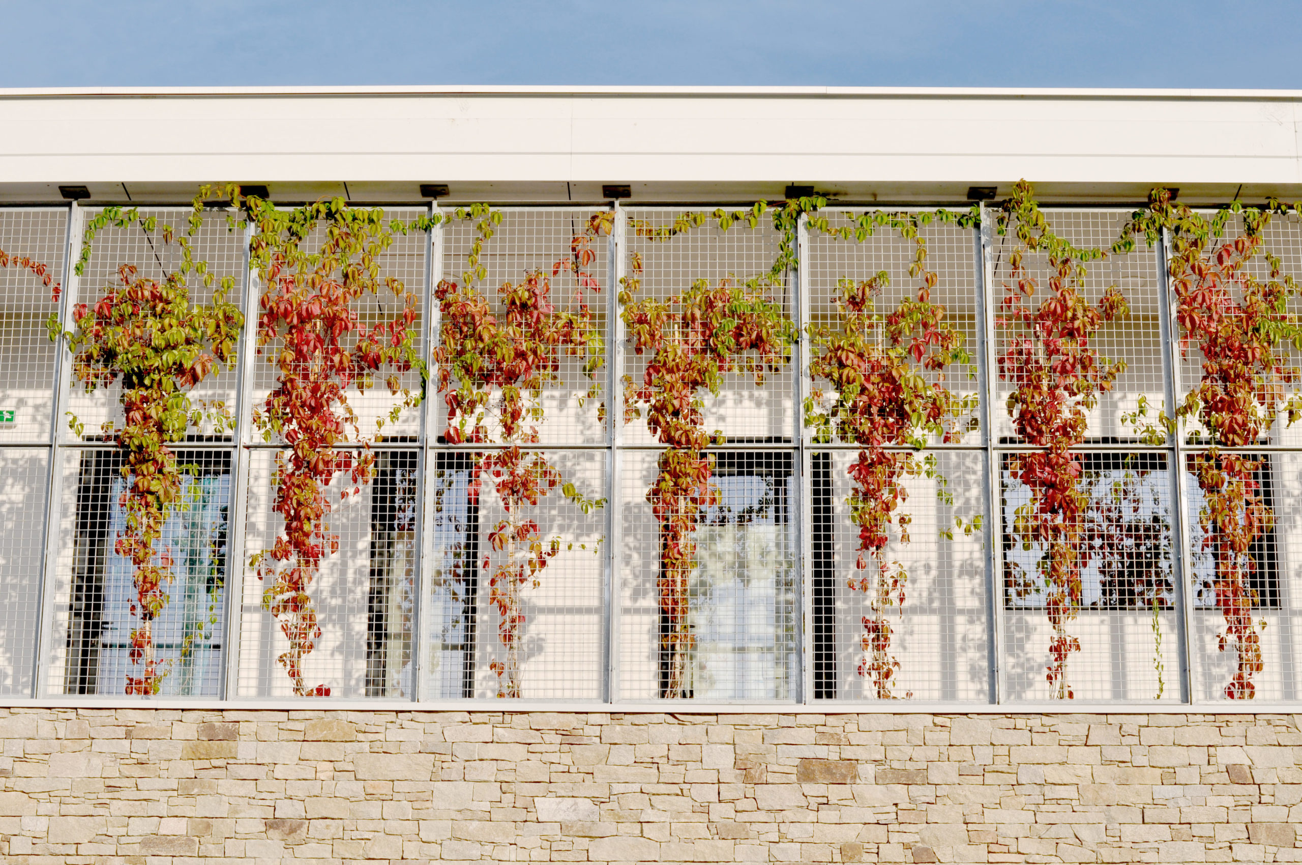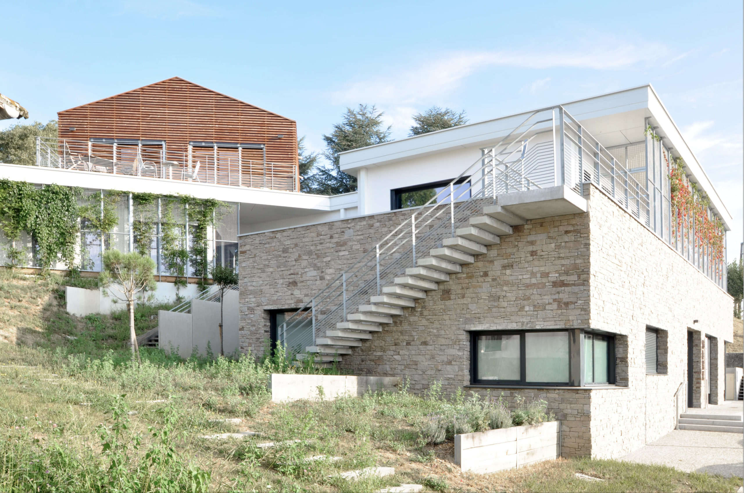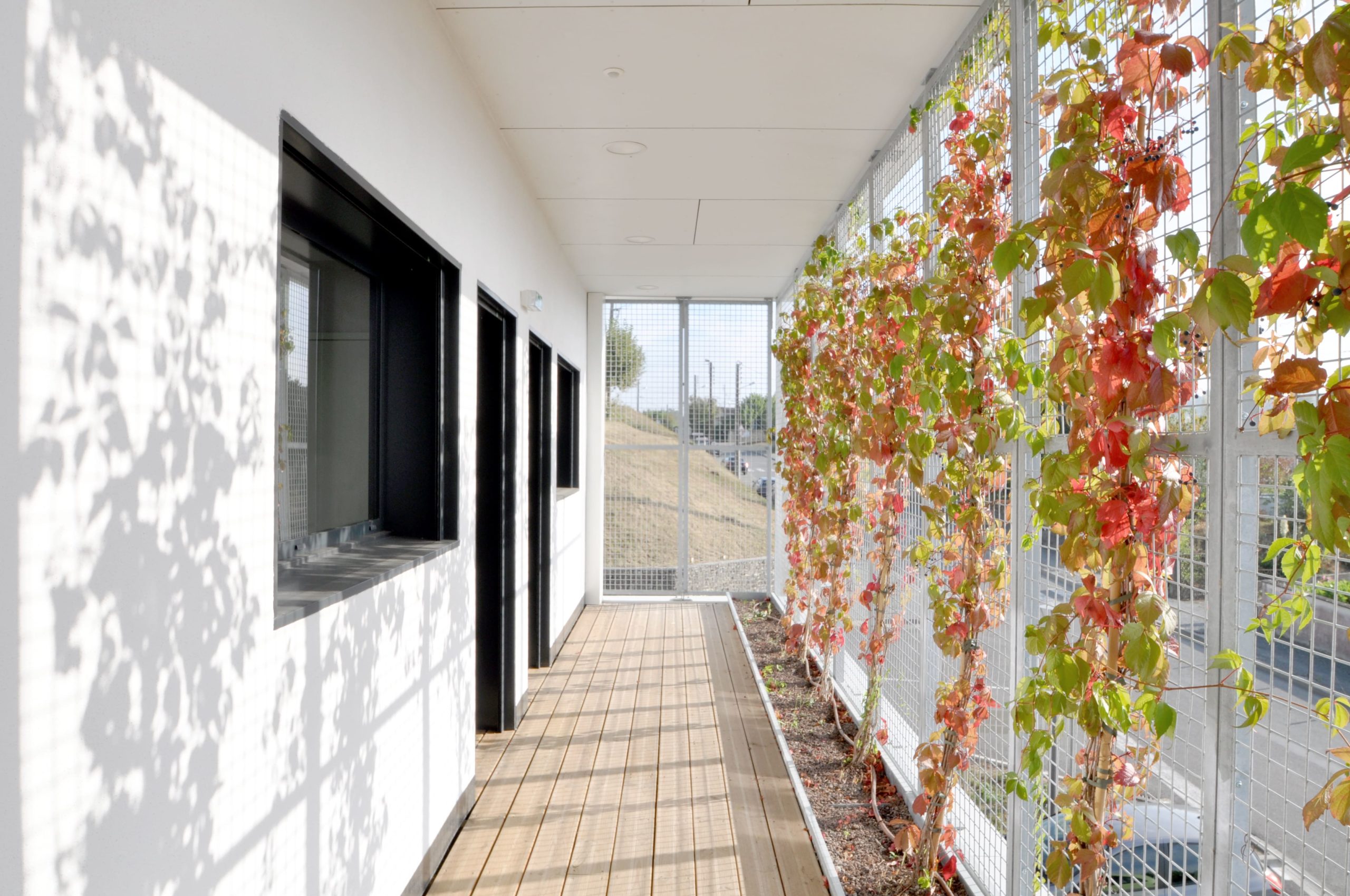 Se développe ainsi un petit jardin d’agrément, lieu de promenade ou d’attente. Les circulations sont larges et se dilatent pour développer des espaces d’attente. Trois strates de matériaux correspondent aux trois niveaux : la pierre, la résille végétale et le bois soulignent le caractère domestique voulu de cet établissement de santé.