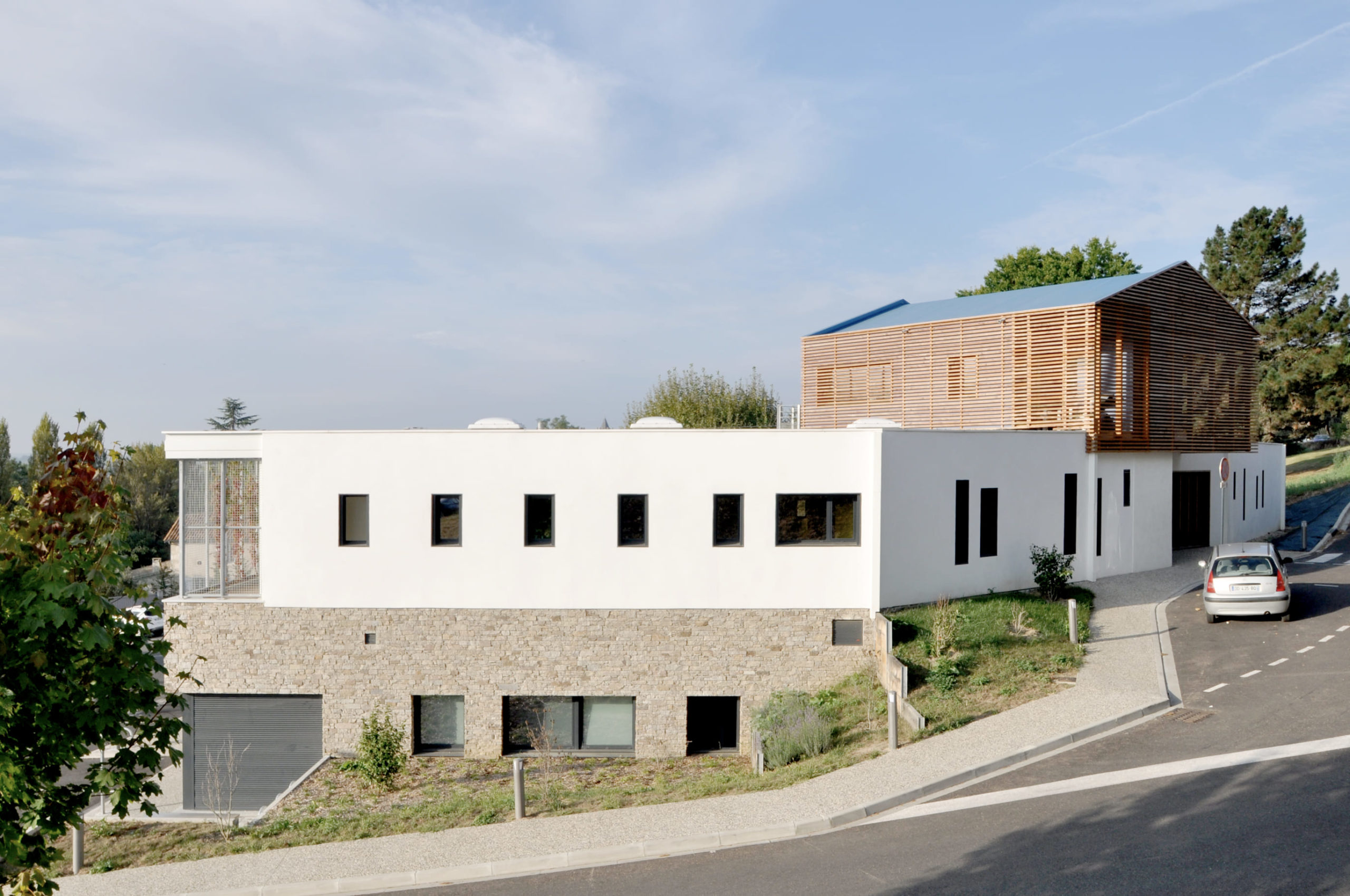 Sur un terrain étroit et en pente, proposé par le groupe hospitalier de La Réole, nous avons créé un bâtiment en forme de croissant pour donner à chaque espace l’orientation et la lumière idéale.