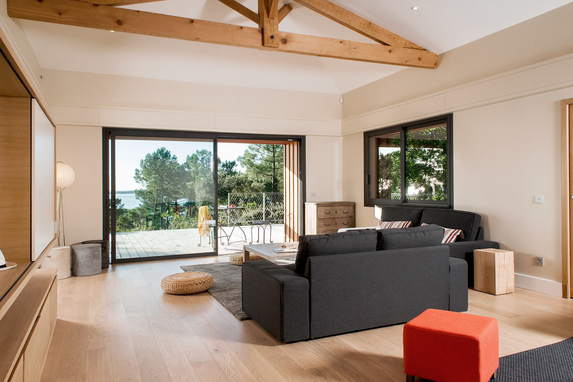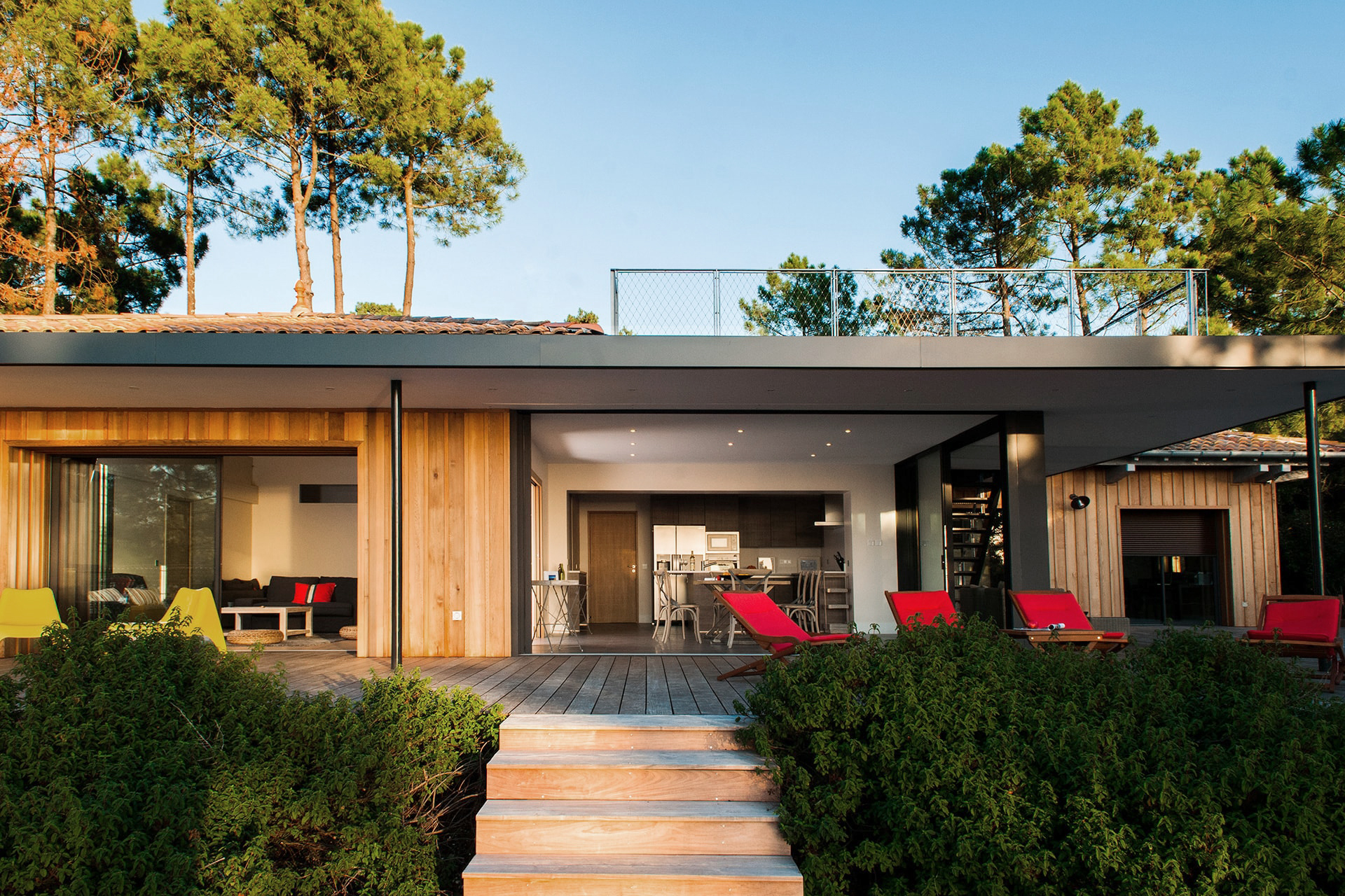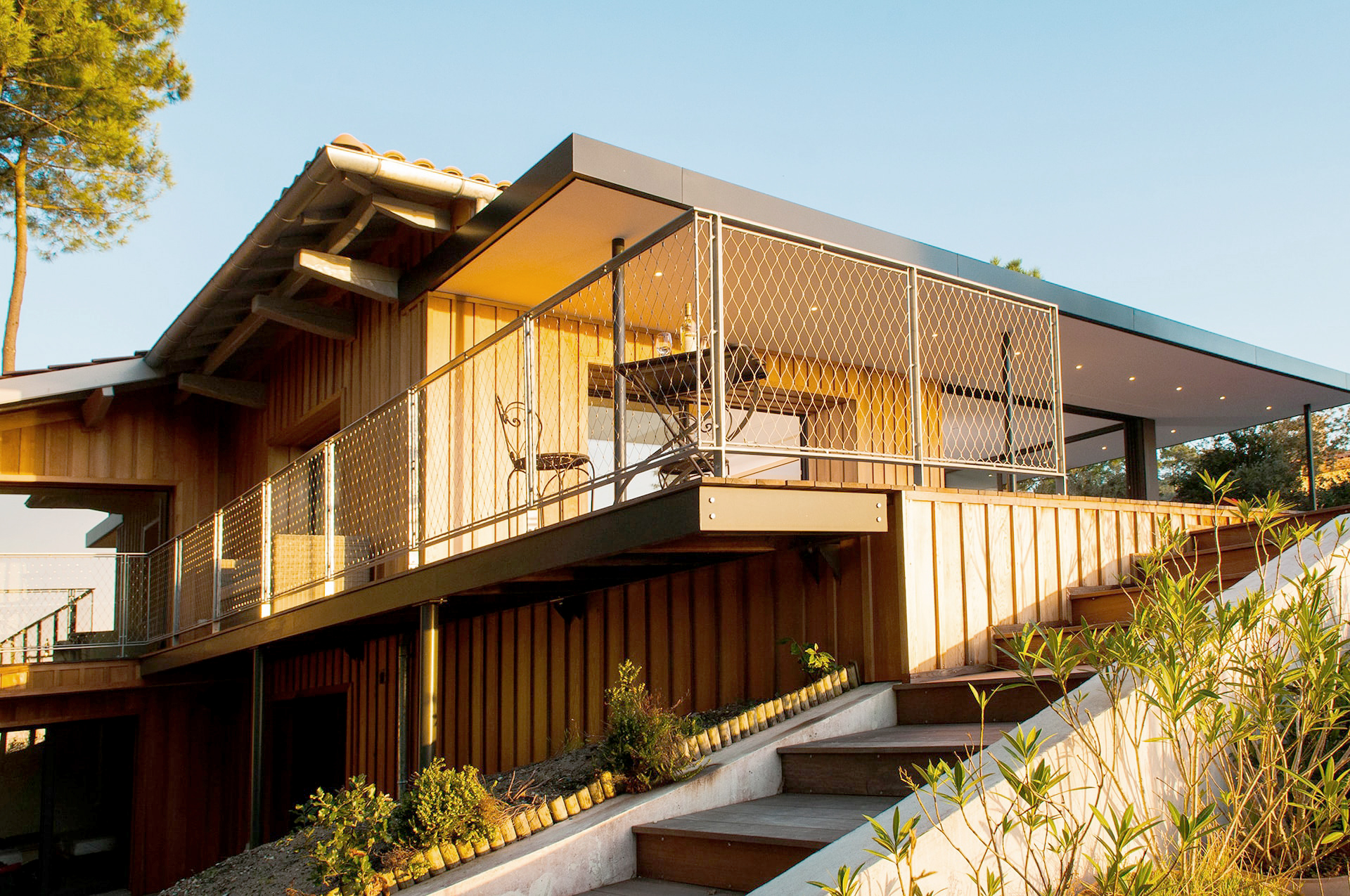 La vue est a couper le souffle. À travers les pins, se dévoile le bassin et ses multiples couleurs tout au long de l’année. Chaque réunion de chantier était un nouveau prétexte pour redécouvrir sans cesse cette vue.