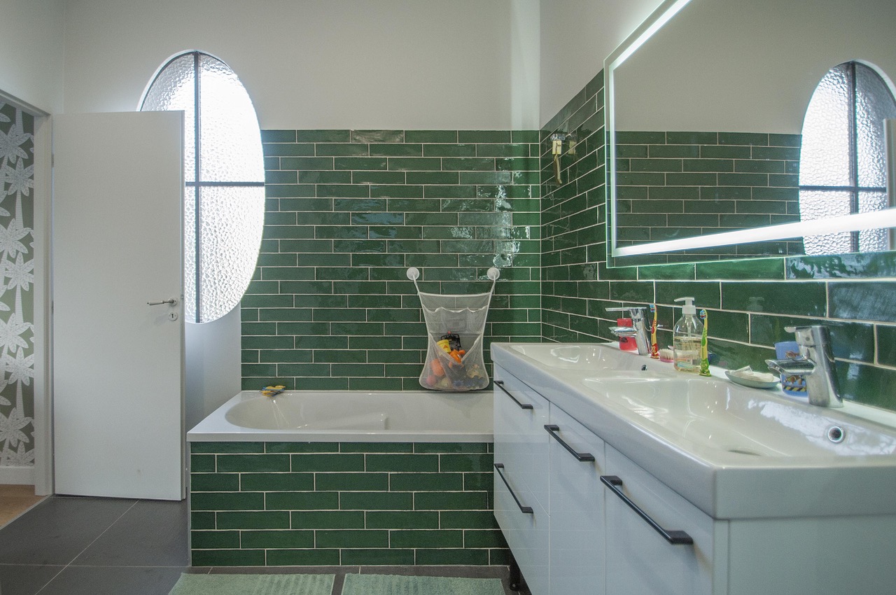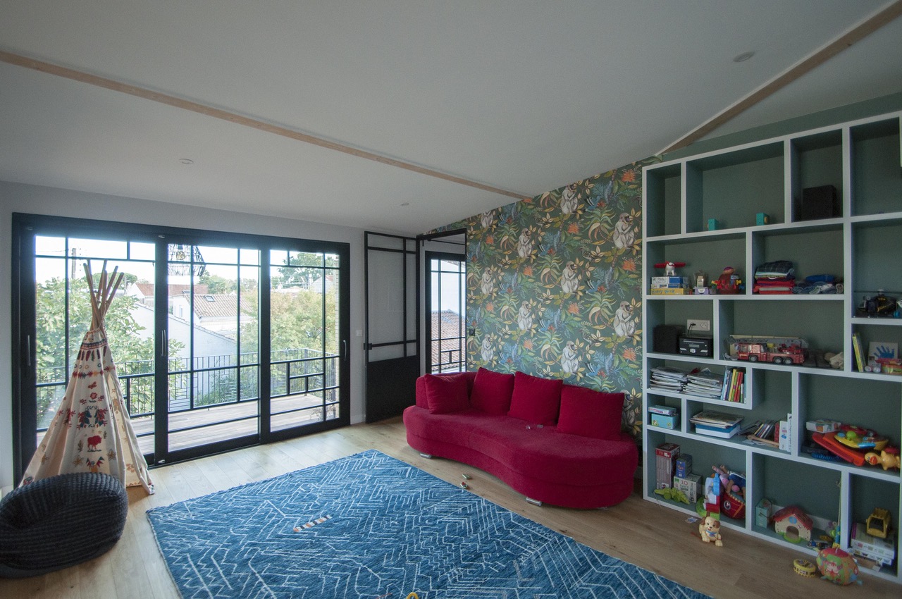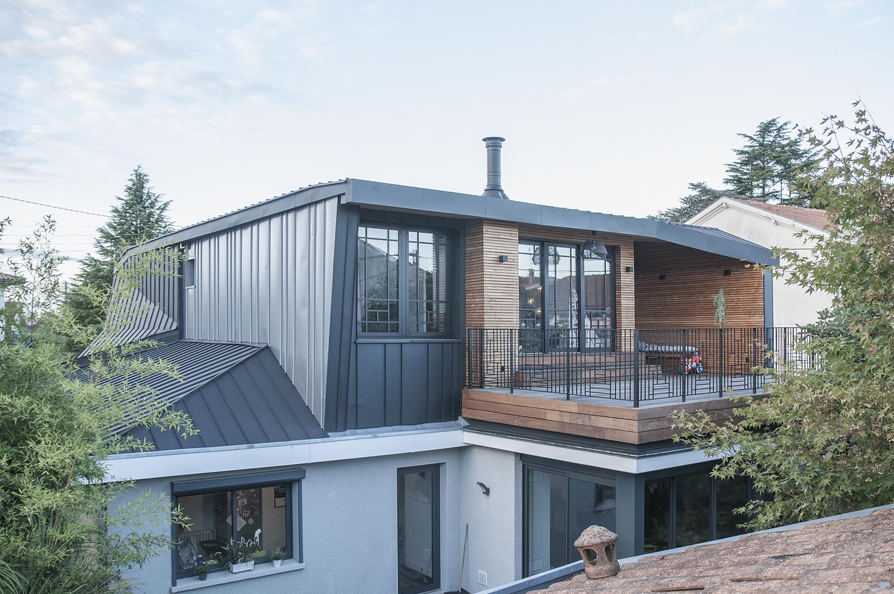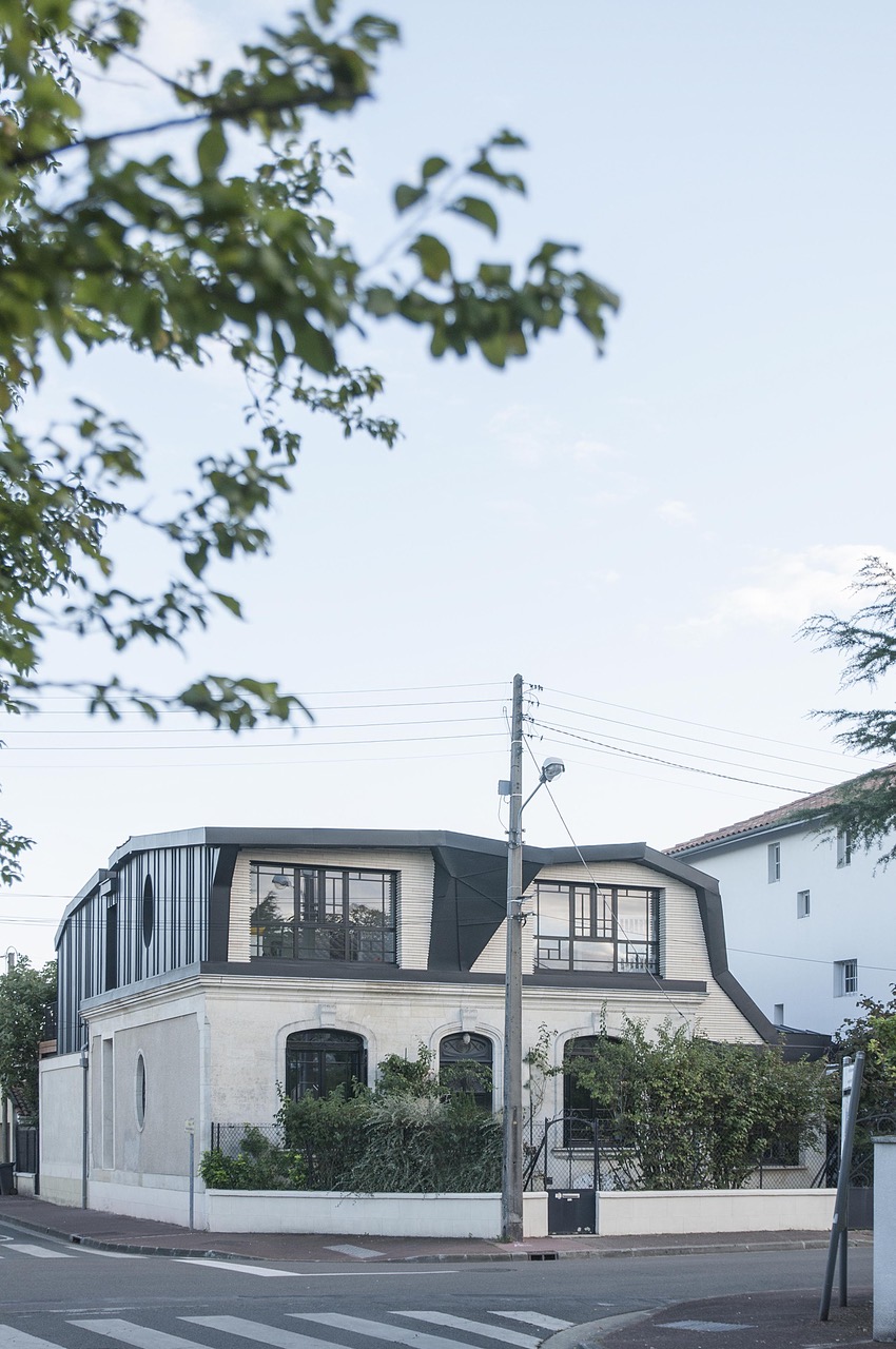 Harmoniser, c’est le maître-mot de ce projet de surélévation de cette maison en pierre bordelaise et de ses précédentes extensions. Le style art déco, présent sur la façade principale a servi de fils conducteur pour venir ancrer la forme organique du toit.